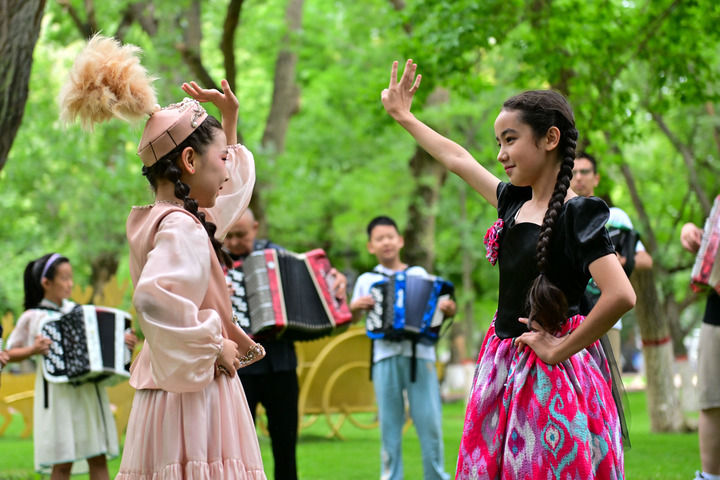 在新疆塔城市文化广场,练习手风琴的孩子随着琴声翩翩起舞(2024年7月24日摄)。新华社记者 丁磊 摄