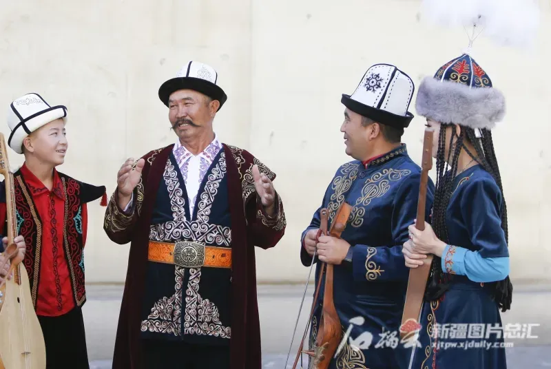 ▲柯尔克孜史诗《玛纳斯》非遗传承人江努日·图日干巴依(右三)回忆见到习近平总书记时的幸福时刻。(图片来源:石榴云/新疆日报记者 谢龙 摄)
