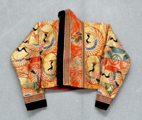 民族文化宫博物馆珍藏着一件清代黑绒边金丝织锦缎和尚领上衣,开襟,长袖,左右开裾,因领部形状与和尚常服相似,故称为“和尚领”。袖身至袖口依次有蓝、红、黄、绿四色接袖,花纹同衣面。袖口及开襟边缘饰五彩二方连续曲尺纹花边,下镶黑绒边,开襟五彩花边内侧另镶一道衣边,上饰牡丹等各色花卉纹样。衣面为黄地金丝织锦花锻,饰“丹顶鹤”纹,里衬红地暗花缎。它是原西藏地方政府俗官出席重要典礼时所着礼服之一,全套装束称王子装。