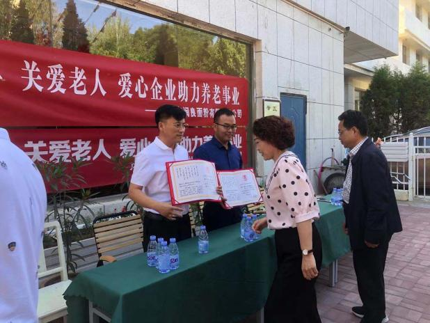 现场爱心企业代表包头市润良面粉有限责任公司总经理杜志华将140桶食用油和70袋面捐赠给养老院代表。