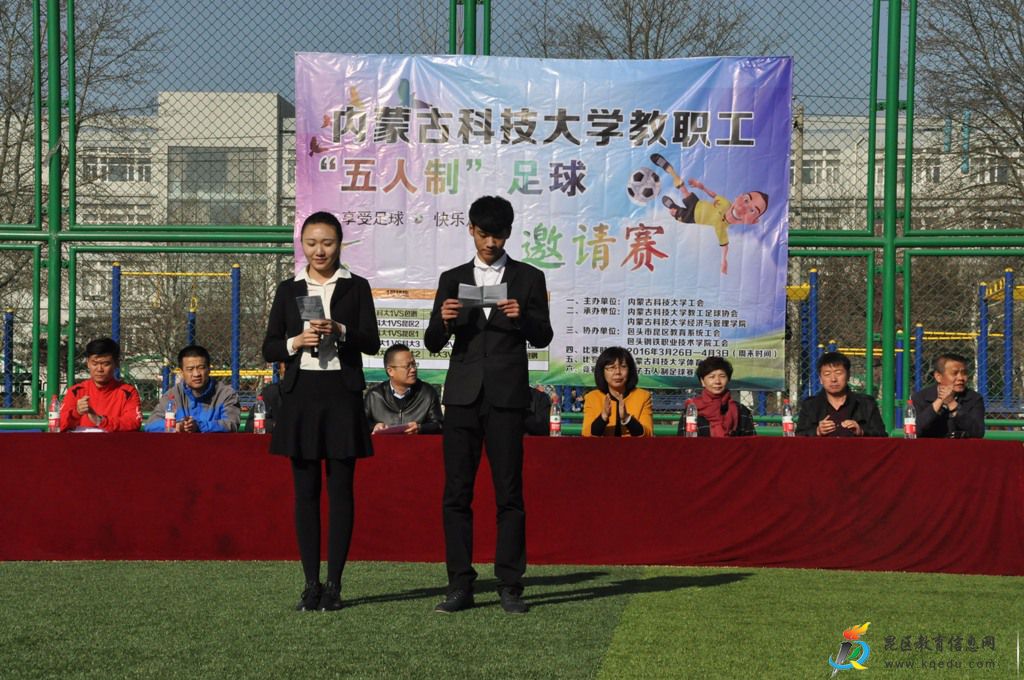 万物复苏,春意盎然,昆区教育系统足球队应邀参加内蒙古科技大学于2016年3月26日—4月3日利用双休日举办的教职工“五人制”足球赛。球赛于3月26日上午在内蒙古科技大学足球场拉开帷幕,教育局副局长王素珍、教育系统工会主席孙艳春参加了开球仪式。
