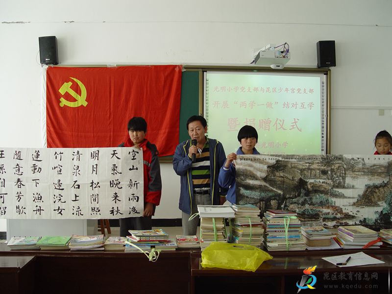 捐书仪式上,刘青云书记和李红利主任将少年宫全体师生捐赠的图书以及承载的爱心转达给了光明小学参会的全体师生,由光明小学部分留守儿童表演的《感恩的心》将活动推向了高潮,感动了在场的所有人。少年宫老领导兰建军将自己创作的字画也同时一并捐赠给了固阳光明小学,使这次活动的主题“让爱在书香中传递”得到了升华。光明小学党支部韩书记代表全校师生对此次共建活动表示谢意的同时也表达了希望两校结对共建让爱继续传递下去的美好愿望。