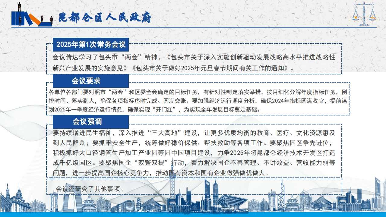会议指出,各单位各部门对照两会区委全会确定的目标任务,有针对性制定落实举措,按月细化分解年度指标任务,倒排时间、落实到人,确保各项指标序时完成、圆满交账加强经济运行调度分析,确保2024年指标圆满收官,提前谋划2025一季度经济运行情况,确保实现开门红,为实现全年发展目标奠定基础加强重点项目建设,强化项目库动态调整和补充,对在库项目进行逐一核实,合理调整项目数量及年度投资计划规模,保持项目数和投资规模相对稳定要按照轻重缓急的原则,进一步抓好重点项目立项、环评、能评等前期手续办理工作,确保开春即开工。顶格推进招商引资,实施招商引资百日攻坚行动,坚持抓大不放小,确保一季度落地亿元以上投资项目10个以上,招商工作取得实效大力发展现代服务业,在发展好现有工业设计等生产性服务业存量企业的基础上,积极引进培育新增量区商务局要制定物流业发展的方案举措,逐项解决物流企业发展中存在的返程空驾率高、同质化竞争等问题,推动物流业高质量发展区文旅局要学习先进地区先进经验,着力挖掘和打造昆都仑文化资源,讲好昆都仑故事,主动承接黄河文旅带、城郊休闲圈、钢铁军工博览园建设,积极对接上级部门打造贯穿主线和融汇历史的城市文化形象和标识,形成一批具有昆区特色的工文旅”“农文旅亮点。持续增进民生福祉,深入推进三大高地建设,让更多优质均衡的教育、医疗、文化资源惠及到人民群众;要抓牢安全生产,统筹做好稳价保供、帮扶救助等各项工作。聚焦园区争先进位,积极抓好大口径钢管生产加工产业园园中园项目建设,力争2025年将昆都仑经济技术开发区打造成千亿级园区。聚焦国企双整双提行动,着力解决国企不善管理、不讲效益、营收能力弱等问题,进一步提高国企核心竞争力,推动国有资本和国有企业做强做优做大。
