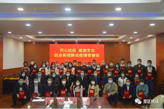 2022年5月10日下午,昆区区委统战部、区工商联举办了“同心抗疫 感谢有你”抗击新冠肺炎疫情答谢会,向在疫情期间参与捐赠的区工商联各会员企业及企业家们、各民主党派、知联会、新联会成员们颁发了荣誉证书和锦旗,感谢大家勇担社会责任,挺身而出,同心战疫,为守护全区人民的健康安全作出了积极的贡献!区委常委、统战部长张国强出席答谢会。各捐赠企业负责人、捐赠企业家个人、民主党派负责人及受赠单位代表——包钢预保中心孙淑兰书记等40余人参加了答谢会。
